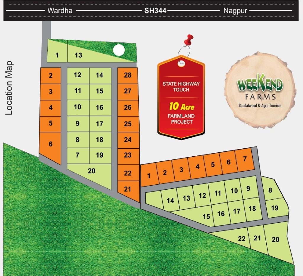 Discover your ideal farmland at Weekend Farms, a 10-acre agro-tourism project located right on State Highway 344 between Wardha and Nagpur. This well-planned layout features clearly numbered plots with wide internal roads, excellent connectivity, and lush green surroundings — perfect for sandalwood farming or a weekend retreat.